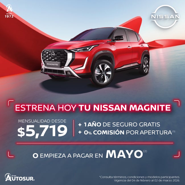 Se aplica para MAGNITE ADVANCE CVT 26 en plan tradicional Credi Nissan con el 35% de enganche a 72 meses, 1 año de seguro gratis y 0% comisión por apertura. Tasa anual de 11.76% y CAT promedio sin IVA de 13.3%. (2) Aplica para todas las versiones Magnite 2026 en operaciones de crédito celebradas con Credi Nissan. No aplica con otras promociones ni en compra de flotillas. Para conocer planes y modalidades de crédito, verificar precios, requisitos de contratación, comisiones, disponibilidad, términos y condiciones, consulta a tu Distribuidor Autorizado Nissan. Vigencia del 04 de febrero al 02 de marzo 2026.
